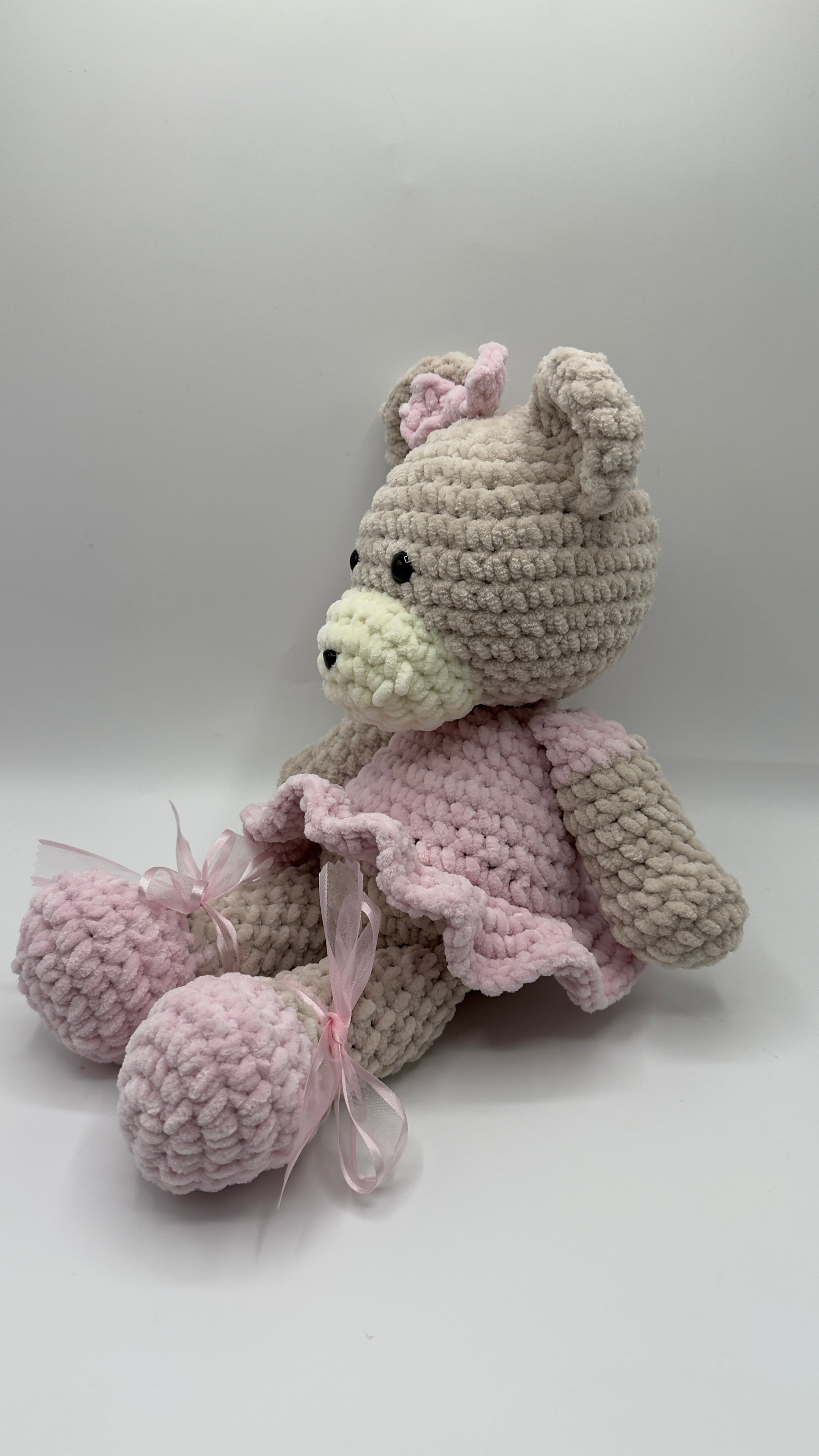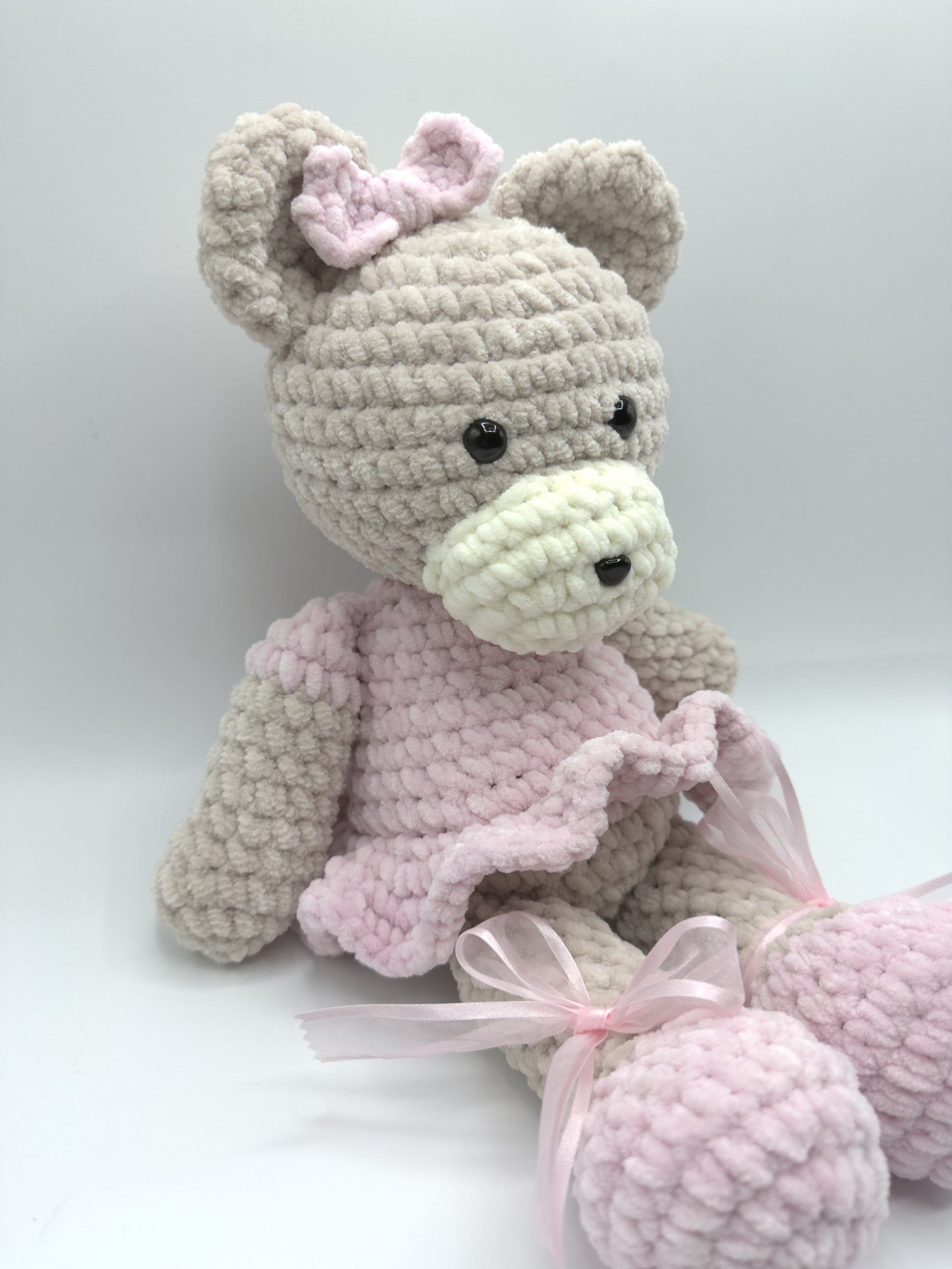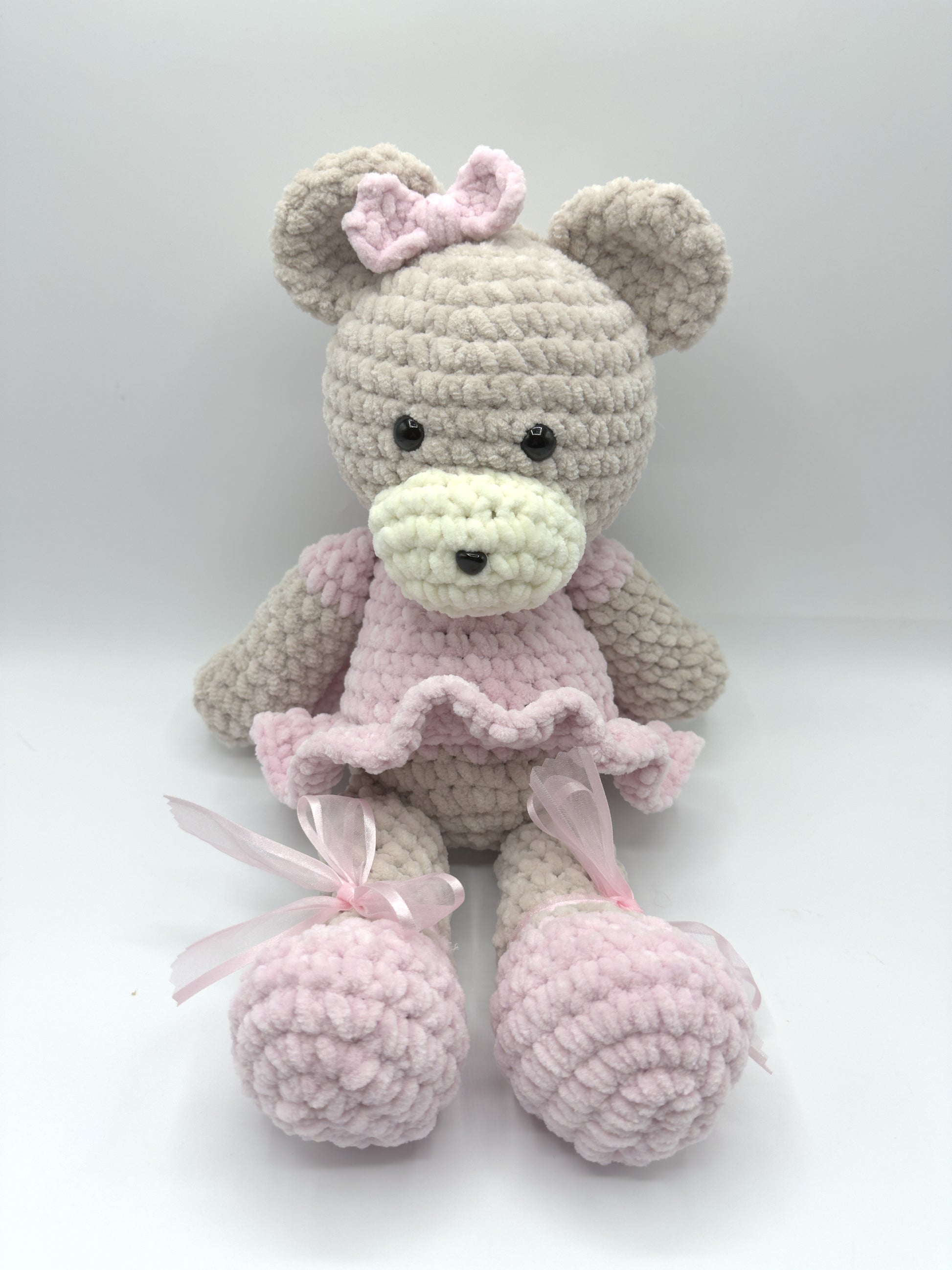 ¡Conoce a nuestra Osita Bailarina, la compañera de sueños perfecta! Tejida a mano con un amor infinito, esta pequeña artista viene lista para su primera función con su delicado tutú rosa y sus zapatillas de ballet con listones de organza.