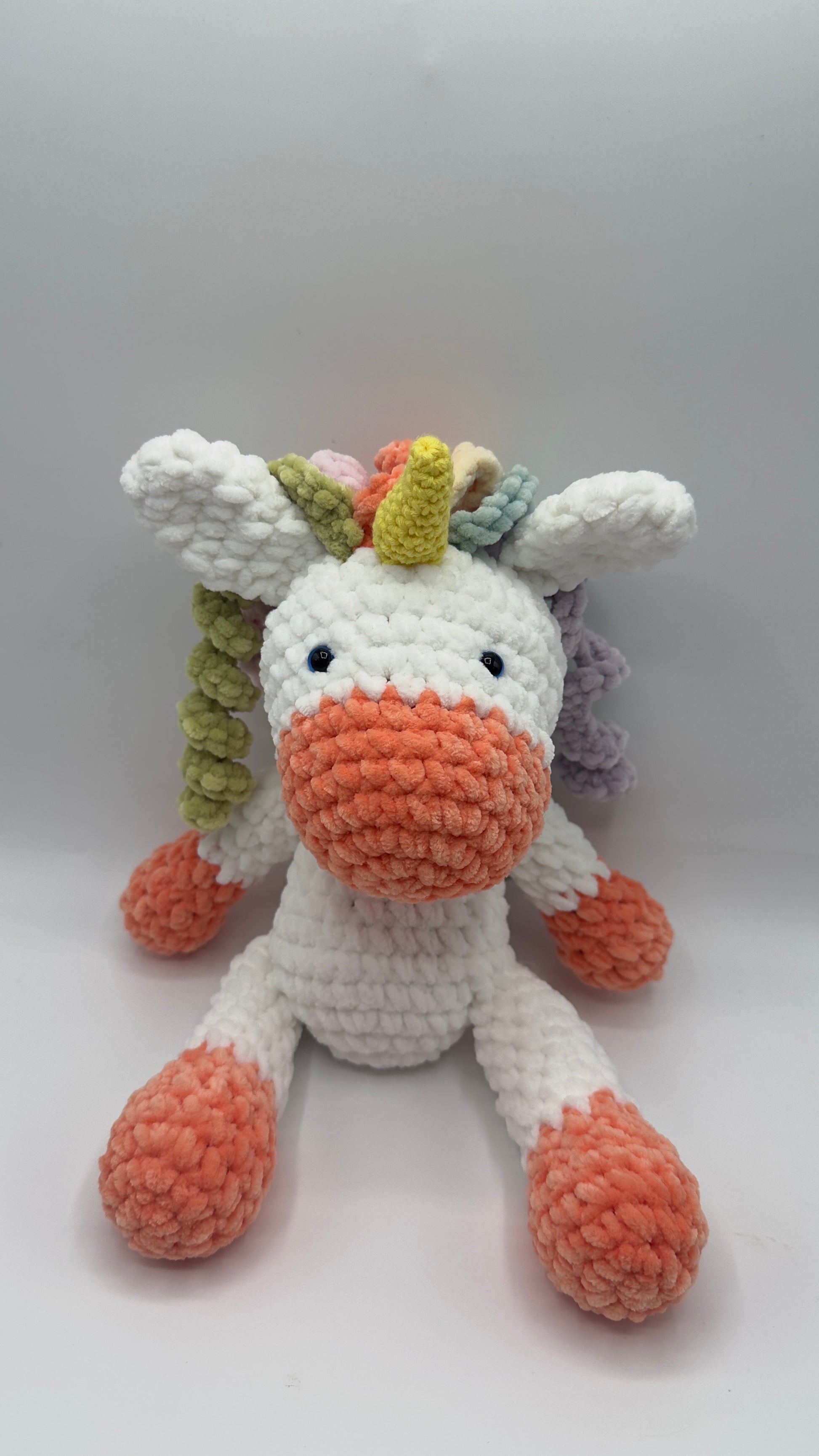 ¡Magia y suavidad en un solo peluche! Este encantador unicornio tejido artesanalmente es el compañero perfecto para soñar despierto. Con su melena rizada de colores y su textura ultra suave, está diseñado para robar corazones y decorar con un toque de fantasía cualquier habitación.