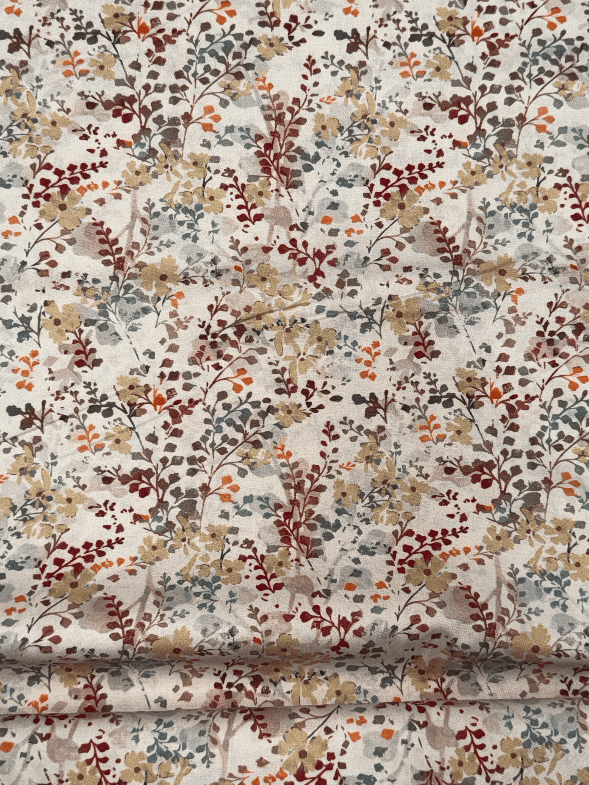 El estampado se sitúa sobre un fondo crema muy suave lo que ayuda a que los colores otoñales resalten. Esta tela es ideal para moda vintage, boho-chic o cualquier proyecto que requiera un estampado floral con una paleta de colores neutral y profunda.