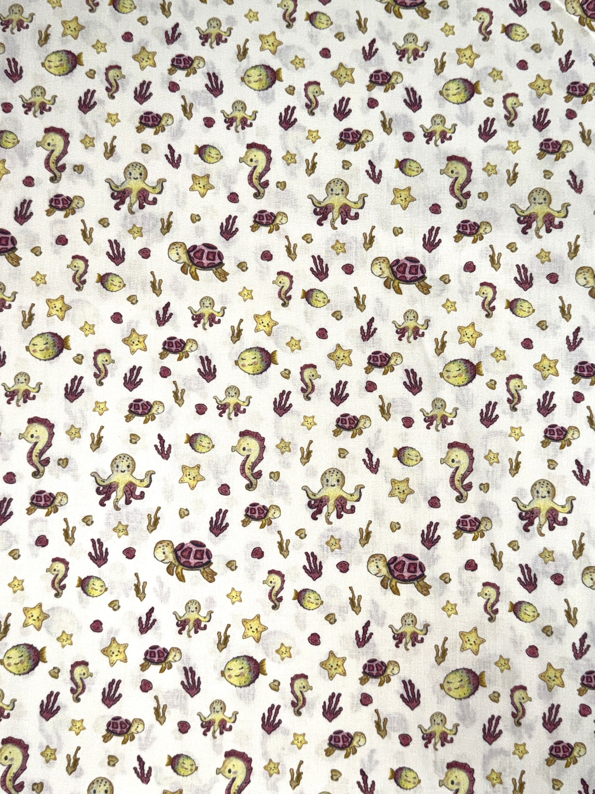 Tela popelín 100% algodón con un encantador estampado marino lleno de animales acuáticos. El diseño incluye tortugas, caballitos de mar, pulpos, estrellas de mar, peces y algas, todos distribuidos de forma uniforme sobre un fondo blanco suave.