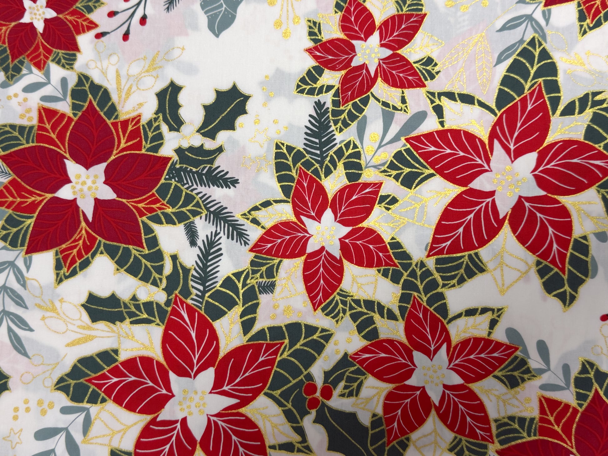 Tela popelín 100% algodón decorativa con un vistoso diseño de flores de Nochebuena, símbolo clásico de la Navidad. Presenta grandes flores rojas con detalles en dorado, hojas en tonos verdes profundos y delicados elementos decorativos que aportan brillo y elegancia sobre un fondo claro.